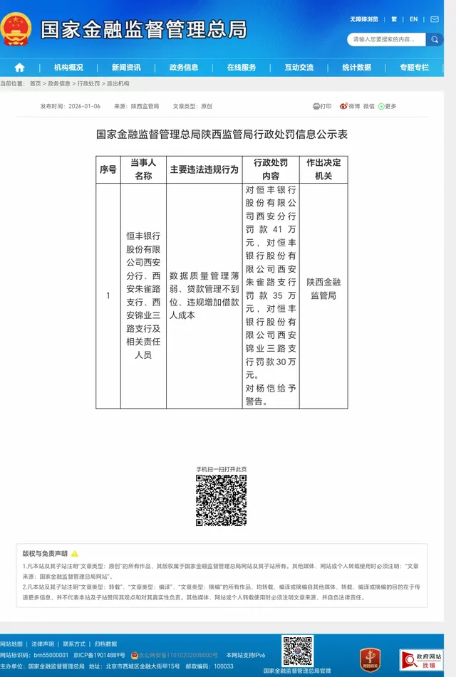 国家金融监督管理总局陕西监管局2026年1月6日披露的行政处罚信息显示,恒丰银行西安分行及两家支行因多项违规共领罚106万元,相关责任人同步被追责。这并非孤立事件——而是恒丰银行2025年全年“罚单风暴”的尾声之一。就在刚刚过去的这一年,该行累计被各级金融监管部门处罚金额突破8000万元,叠加2024年的近2000万元,两年罚没总额已超亿元。其中,仅2025年9月,国家金融监督管理总局就对其总行开出高达6150万元的天价罚单,创下当年股份制银行单笔处罚之最。