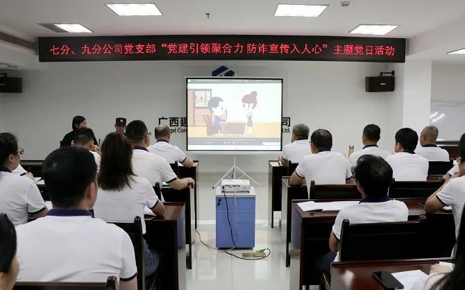 8月18日,广西建工集团控股有限公司第七分公司、第九分公司党支部联合开展“党建引领聚合力 防诈宣传入人心”主题党日活动,特邀南宁市公安局滨湖派出所民警到现场宣讲防诈知识。七分公司党支部书记刘雄,七分公司总经理、工会主席周田生,九分公司党支部书记、总经理黎克,七分公司副总经理、安全总监葛锋,九分公司副总经理严良州参加。