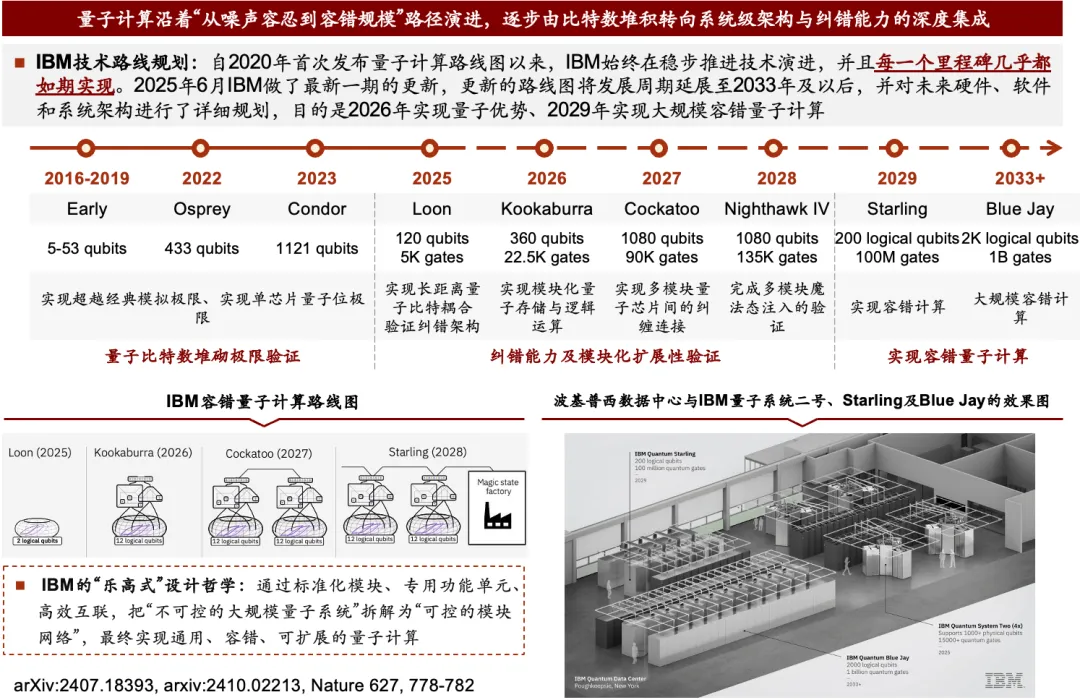 以IBM为代表的行业巨头展现出极强的自信与乐观,其最新路线图规划在2026年实现量子优越性,并激进地预测将在2029年通过“Starling”处理器实现具有200个逻辑比特的容错量子计算 。Google与PsiQuantum等主流硬件公司亦在加速推进,试图在2030年前后跨越容错门槛。但考虑到纠错及系统扩展带来的一系列巨量工程化难题,我们对此持相对中立的态度,认为技术落地节奏不会早于大厂预期:
