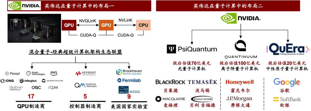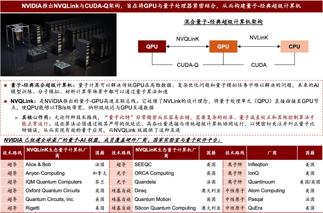 算力霸主构建生态基座:英伟达在2025年完成了从观望到“基础设施构建者”的战略转身。通过发布NVQLink互连技术并连续参投Quantinuum、PsiQuantum等头部企业,英伟达正试图将量子计算无缝接入其主导的HPC(高性能计算)生态,确立“量子-经典混合计算”的事实标准。