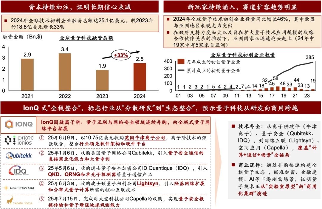 经历过早期的炒作周期后,2024-2025年的资本市场呈现出明显的理性回归与结构性复苏,投资逻辑从“广撒网”转向“精准狙击”。2024年全球量子技术初创企业的投资额同比增长约50%,达到20亿美元。信通院数据显示,2024年全球披露的投融资事件达170笔,其中A轮及以前的早期投资非常活跃。资金流向呈现出显著的“哑铃型”分化,并伴随着两大新趋势:科技巨头的生态卡位与头部企业的跨国并购整合。
