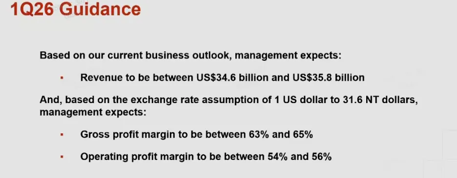 台积电2025年Q4营收337.3亿美元,高于公司指引上限(322-334),同比增加25.5%,环比增加1.9%;毛利率62.3%,高于公司指引上限(59.0%-61.0%);营业利润率54%,高于公司指引上限(49.0%-51.0%)。净利润 505.74 亿新台币(约合 16.36 亿美元,按当季平均汇率 31.01 换算),同比增加35%,环比增加11.9%。25Q4资本开支115.1亿美元,环比+24.16%。