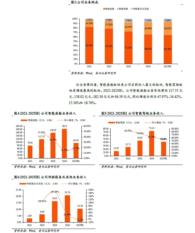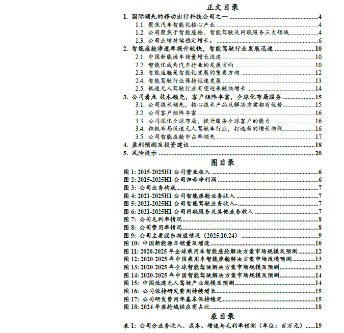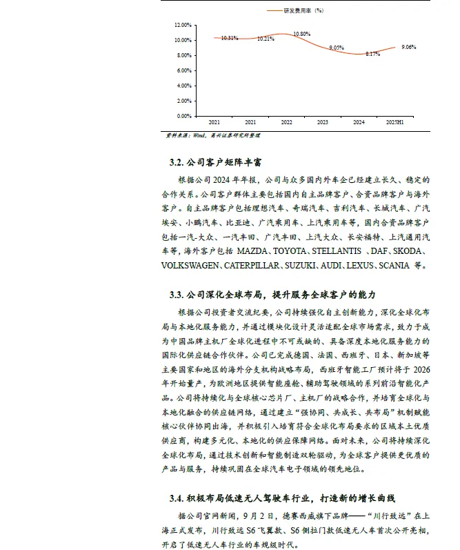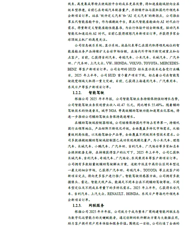 客户矩阵丰富,打造全球服务能力。公司与众多国内外车企已经建立长久、稳定的合作关系。公司客户群体主要包括国内自主品牌客户、合资品牌客户与海外客户。自主品牌客户包括理想汽车、奇瑞汽车、吉利汽车、长城汽车、广汽埃安、小鹏汽车、比亚迪、广汽乘用车、上汽乘用车等,国内合资品牌客户包括一汽-大众、一汽丰田、广汽丰田、上汽大众、长安福特、上汽通用汽车等,海外客户包括 MAZDA、TOYOTA 、STELLANTIS 、DAF 、SKODA 、VOLKSWAGEN 、CATERPILLAR、SUZUKI、AUDI、LEXUS、SCANIA 等。公司已完成德国、法国、西班牙、日本、新加坡等主要国家和地区的海外分支机构战略布局,西班牙智能工厂预计将于2026 年开始量产,为欧洲地区提供智能座舱、辅助驾驶领域的系列前沿智能化产品。