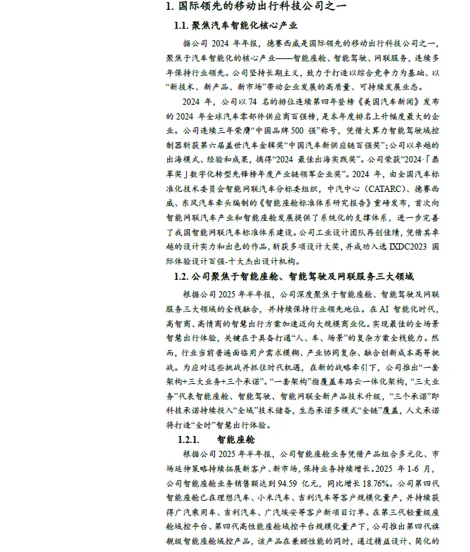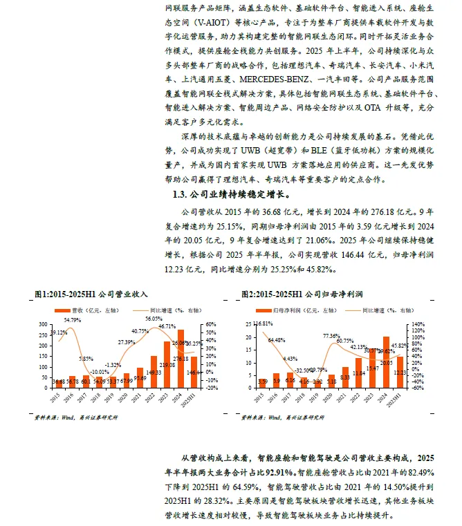 国际领先的移动出行公司。德赛西威是国际领先的移动出行科技公司之一,聚焦于汽车智能化的核心产业——智能座舱、智能驾驶、网联服务,连续多年保持行业领先。目前主要有智能座舱、智能驾驶和网联服务及其他业务。公司业绩保持稳健增长。2015-2024 年公司营收和归母净利润的复合增速分别为25.15%和21.06%。2025H1 公司实现营收146.44 亿元,归母净利润12.23 亿元,同比增速分别为25.25%和45.82%。