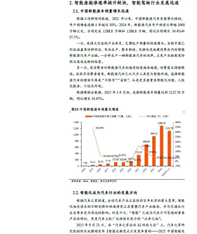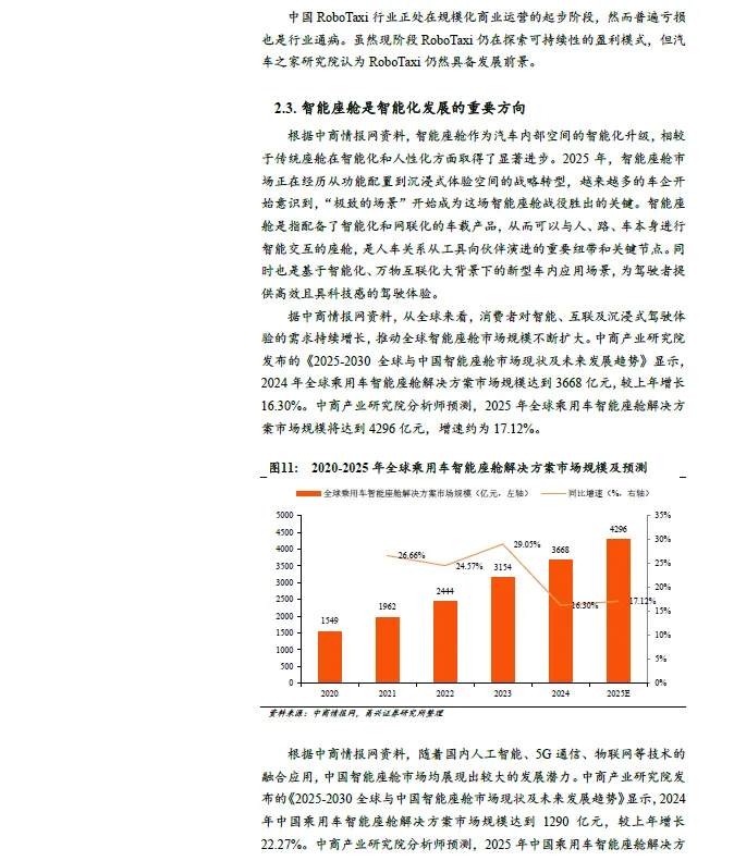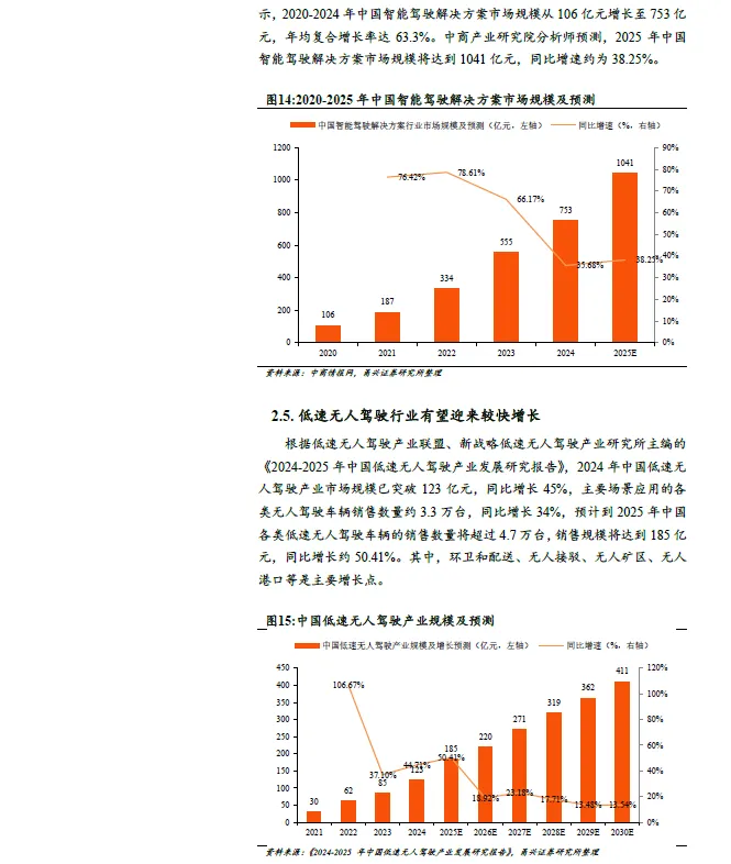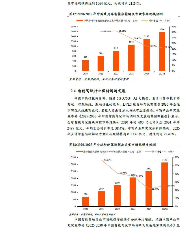 智能驾驶行业增长迅速,国内增速高于全球。中商产业研究院报告显示,全球智能驾驶解决方案市场规模从2020 年的680 亿元增长至2024年的2497 亿元,年均复合增长率达38.4%。2025 年全球智能驾驶解决方案市场规模将达到3132 亿元,增速约为25.43%。2020-2024 年中国智能驾驶解决方案市场规模从106 亿元增长至753 亿元,年均复合增长率达63.3%。2025 年中国智能驾驶解决方案市场规模将达到1041亿元,同比增速约为38.25%。国内市场增速明显高于全球增速。