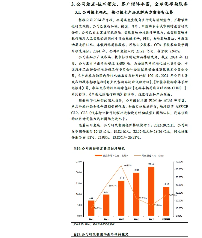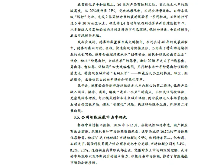 公司技术领先,拥有全栈设计能力。公司高度重视自主研发与创新能力,并持续优化研发效能。公司已在新加坡、德国、日本、中国的多个城市同时设有研发分部。公司已自主掌握智能座舱、智能驾驶全栈设计等能力,在智能驾驶车载领域对人工智能的应用处于行业先进水平,同时,自动驾驶算法、车载显示屏光学技术、车载网络通信技术、网络安全技术、OTA 等技术都处于国内领先地位。。