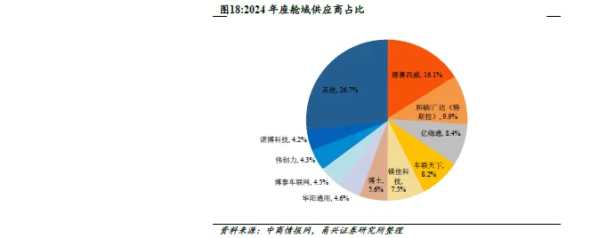 智能座舱行业保持稳健发展,公司市占率领先。中商产业研究院分析师预测,2025 年全球乘用车智能座舱解决方案市场规模将达到4296亿元,增速约为17.12%。2025 年中国乘用车智能座舱解决方案市场规模将达到1564 亿元,同比增长21.24%。根据中商情报网数据,2024年1-12 月,座舱域控加速渗透,国产供应商抢占前排。从装机量和市场份额数据来看,德赛西威以16.1%的市场份额位居榜首。