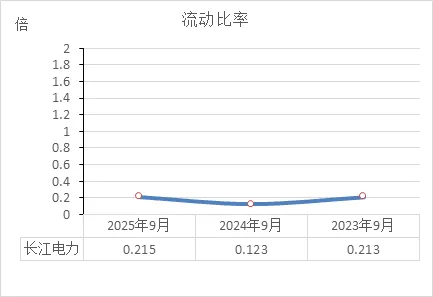 数值解读:比率始终远低于1(2024年最低至0.123),意味着账面上的短期资产无法覆盖短期负债。这对绝大多数公司是危险信号,但对长江电力是正常的。