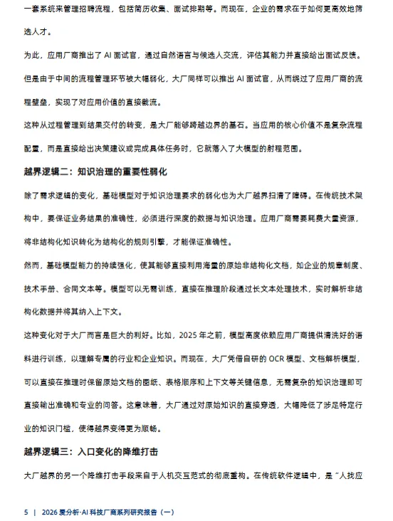 ✅ 越界逻辑深度拆解:从企业需求(流程管理→结果交付)、技术路径(知识治理弱化)、交互范式(人找应用→应用找人)三大维度,解析大厂渗透应用层的底层驱动因素。