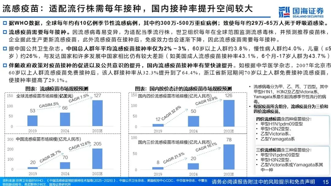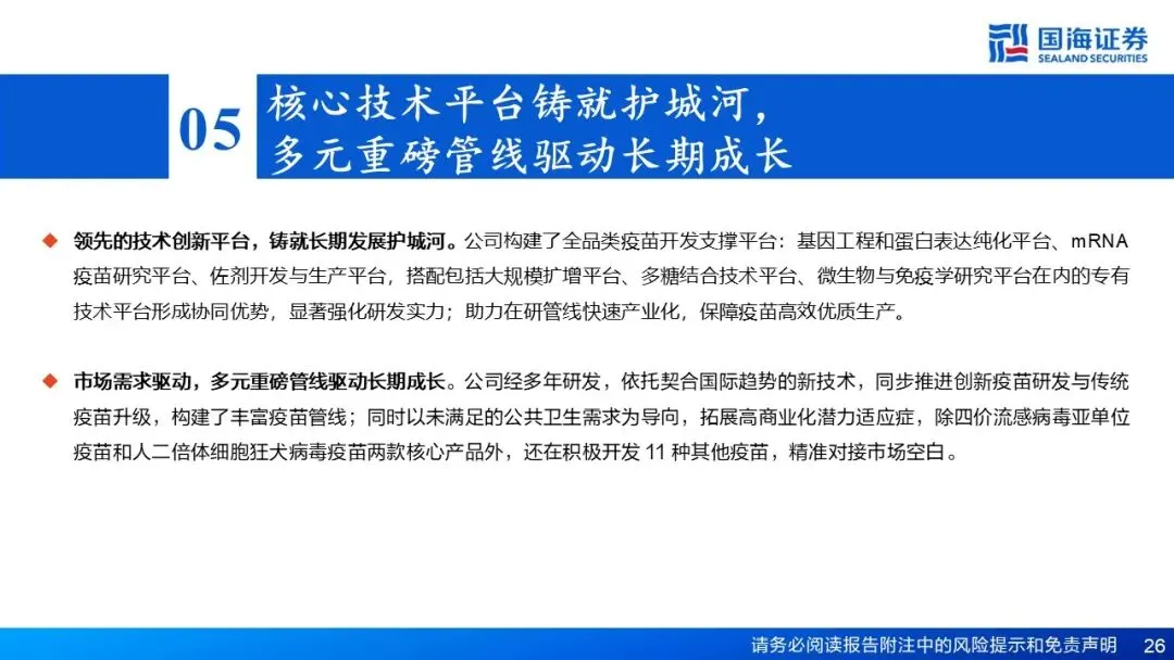 领先的核心技术平台,构建了覆盖传统升级与前沿创新的丰富管线(11项在研),增长接力棒清晰。公司经多年研发,依托契合国际趋势的新技术,打造了全面的疫苗开发支撑平台和专有技术平台,同步推进创新疫苗研发与传统疫苗升级,构建了丰富疫苗管线;以未满足的公共卫生需求为导向,拓展高商业化潜力适应症,除四价流感病毒亚单位疫苗与人二倍体细胞狂犬病毒疫苗两款核心产品外,公司还在积极开发 11 种其他疫苗,精准对接市场空白。