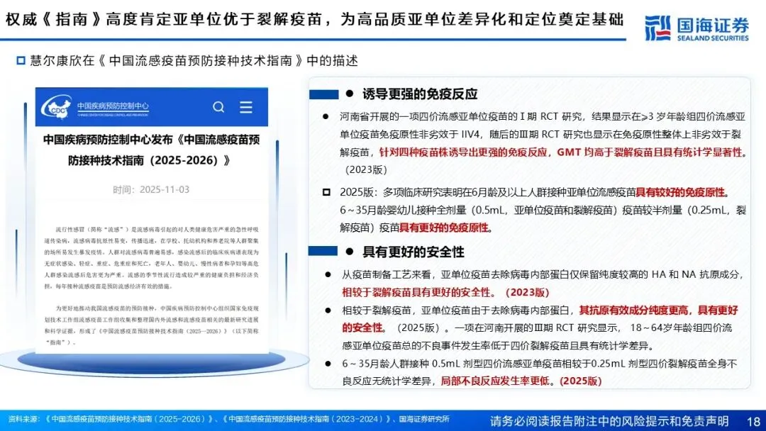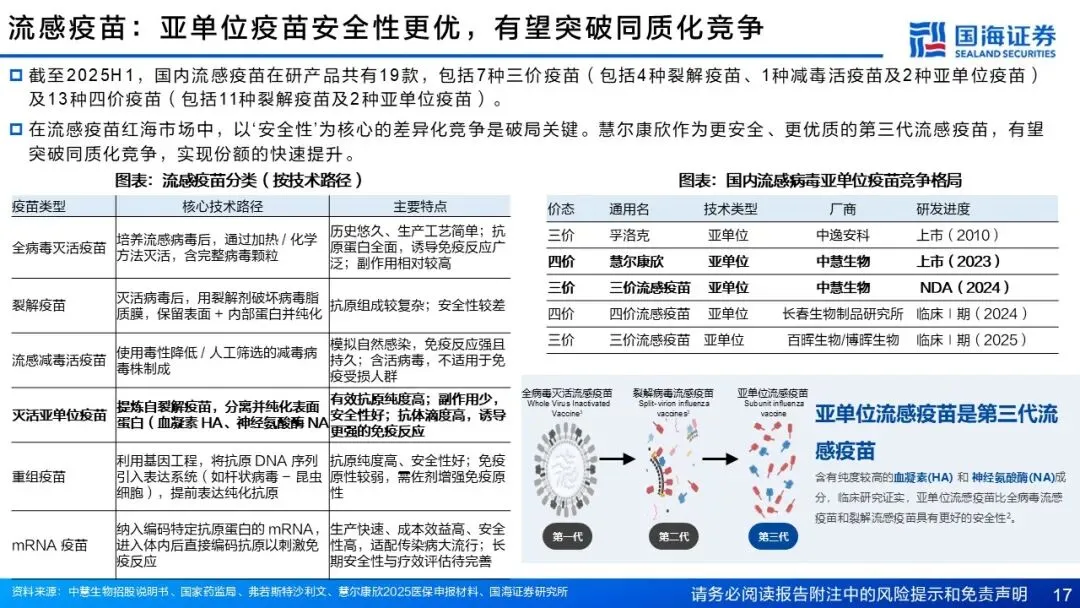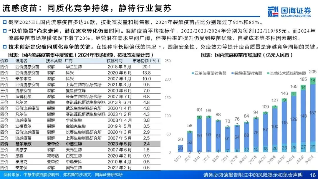 慧尔康欣(四价流感病毒亚单位疫苗):更高的安全性+良好的免疫效果,精准切入高端流感疫苗市场蓝海。国内流感疫苗潜在增长空间广阔,目前裂解疫苗占据大部分市场份额。慧尔康欣是国内首款且唯一的四价亚单位流感疫苗,相比于裂解疫苗,具有保护全面、组分抗原纯度高、不良反应风险低等优势。该产品2023年国内获批上市,针对3岁以上人群,2025年进一步扩龄到6月龄以上人群,2024年实现收入2.6亿元,同比增长398%。作为公司首款获批产品,正处快速放量通道,引领流感疫苗消费升级。
