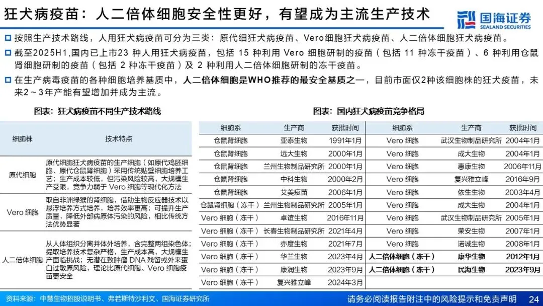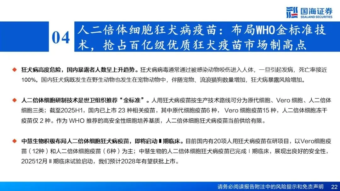 在研人二倍体细胞狂犬病毒疫苗,布局WHO金标准技术,抢占百亿级优质狂犬疫苗市场制高点。狂犬病高度危险,国内暴露者人数呈上升趋势,近几年国内每年约1800万至2000万人接种狂犬疫苗。在狂犬病疫苗生产技术中,人二倍体细胞是WHO推荐的最安全基质之一,目前市面仅2种该细胞株的狂犬疫苗。公司的在研人二倍体细胞狂犬病毒疫苗,Ⅰ期临床试验显示出良好的安全性,同时结合冻干制剂及预灌封稀释剂注射器,并开发多种接种方案,接种更加便捷灵活。2025年12月其Ⅲ期临床试验已启动。