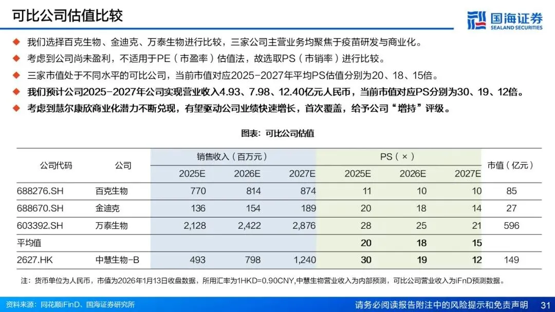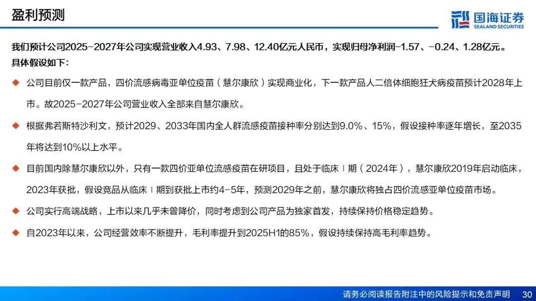 盈利预测和投资评级 我们预测公司有望在2027年实现扭亏为盈,迎来业绩与估值双重提升的“戴维斯双击”。考虑到公司核心产品慧尔康欣持续放量,预计2025-2027年公司实现营业收入4.93、7.98、12.40亿元人民币,实现归母净利润-1.57、-0.24、1.28亿元人民币,公司疫苗管线丰富,发展后劲充足,有望在2027年实现扭亏为盈。首次覆盖,给予公司“增持”评级。