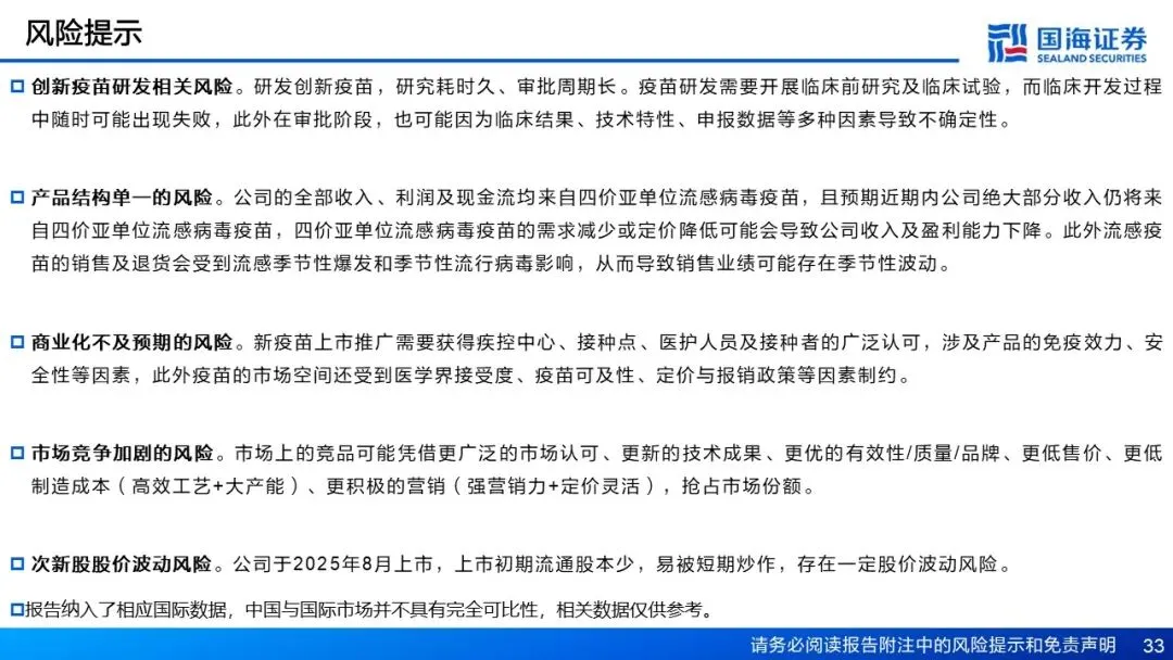 风险提示 创新疫苗研发相关风险、产品结构单一的风险、商业化不及预期的风险、市场竞争加剧的风险、次新股股价波动风险。中国与国际市场并不具有完全可比性,相关数据仅供参考。