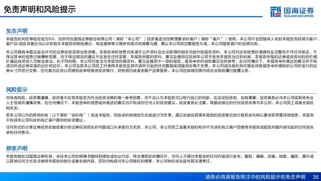 在任何情况下,本公众号所载信息、意见不构成对任何人的投资建议,所述证券或金融工具买卖的出价或征价,评级、目标价、估值、盈利预测等分析判断亦不构成对具体证券或金融工具在具体价位、具体时点、具体市场表现的投资建议。对任何直接或间接使用本公众号所载信息和内容或者据此进行投资所造成的任何一切后果或损失,国海证券及/或其关联人员均不承担任何形式的法律责任。