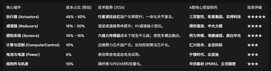下表展示了2026年典型中国产人形机器人(量产型)的BOM结构及对应的A股受益标的: