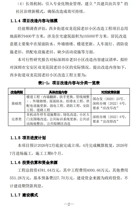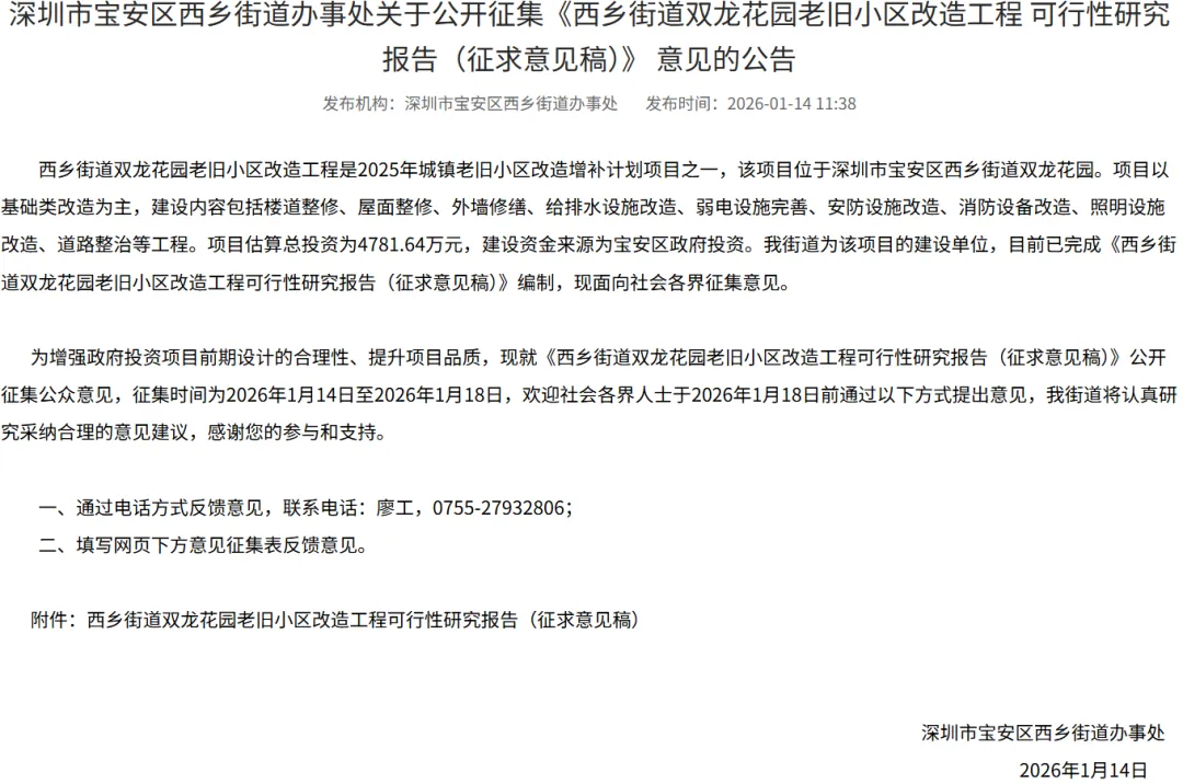 今日, 《西乡街道双龙花园老旧小区改造工程 可行性研究报告(征求意见稿)》发布,宝安区又增加一个老旧小区更新改造。
