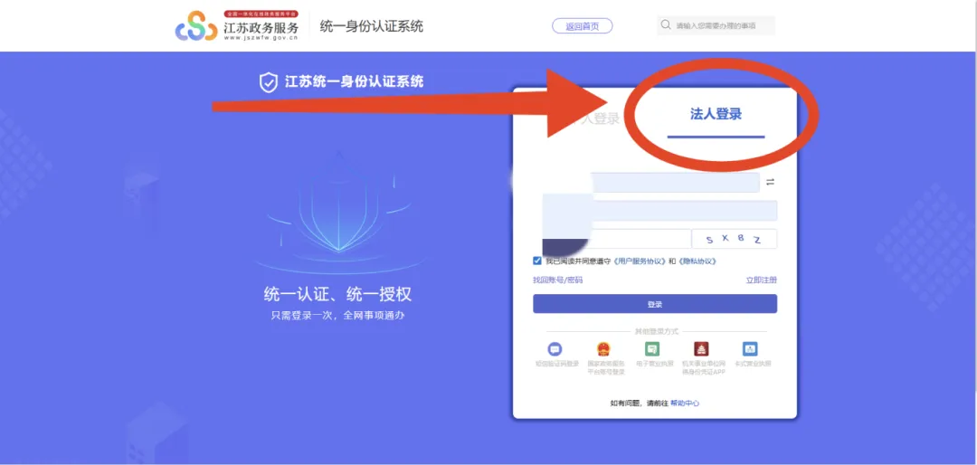 2.选择企业用户,点击“通过江苏政务服务网账号登录”;