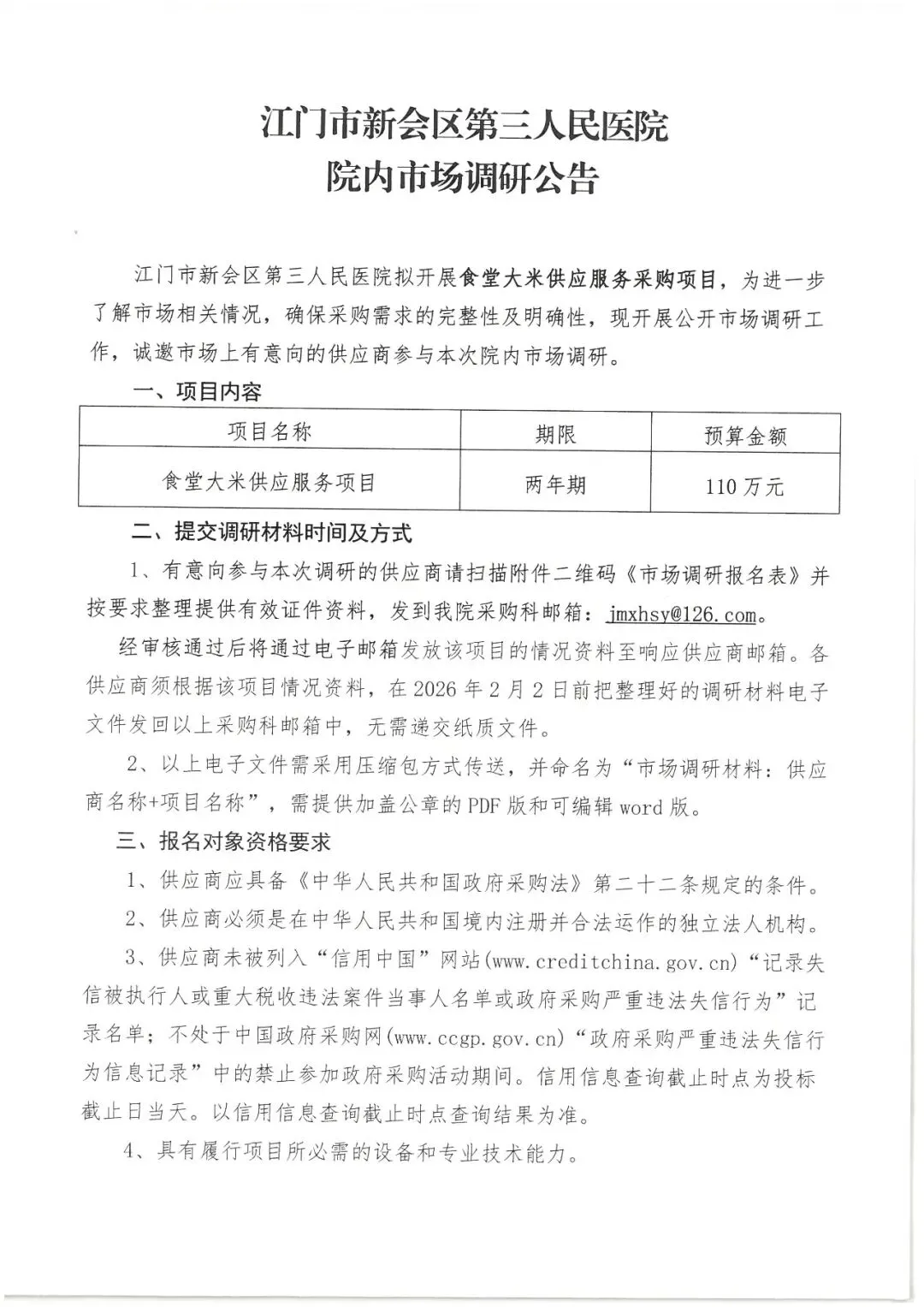 【市场调研公告】新会区第三人民医院食堂大米供应服务项目