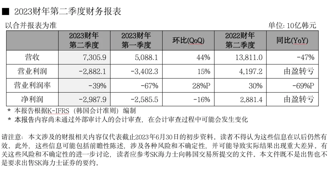 2023年7月26日,SK海力士发布截至2023年6月30日的2023财年第二季度财务报告。公司2023财年第二季度结合并收入为7.3059万亿韩元,营业亏损为2.8821万亿韩元,净亏损为2.9879万亿韩元。2023财年第二季度营业亏损率为39%,净亏损率为41%。