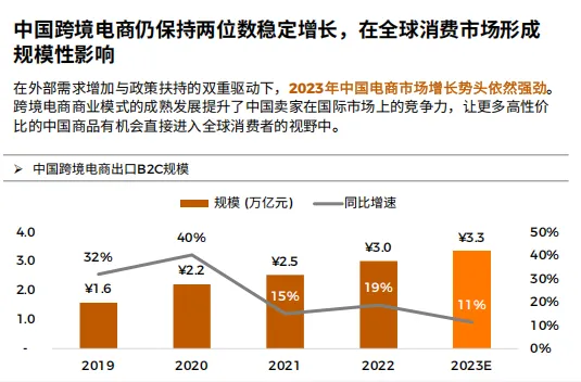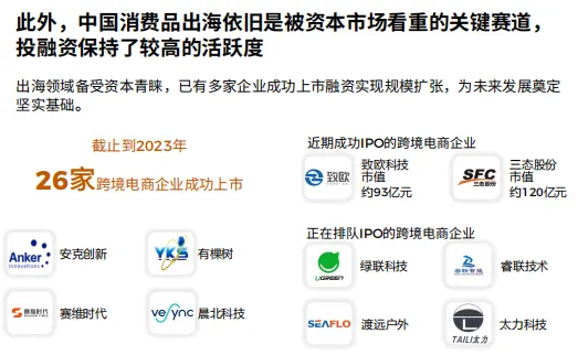 规模红利持续释放,4万亿市场正上演造富运动。报告显示,2023年中国跨境电商B2C出口规模预计达4.0万亿元,同比增速高达32%,赛道仍保持两位数高速增长。资本也加速入局,截至2023年已有26家跨境电商企业成功上市,资本市场坚定支持从“卖货郎”转型为品牌商的企业。