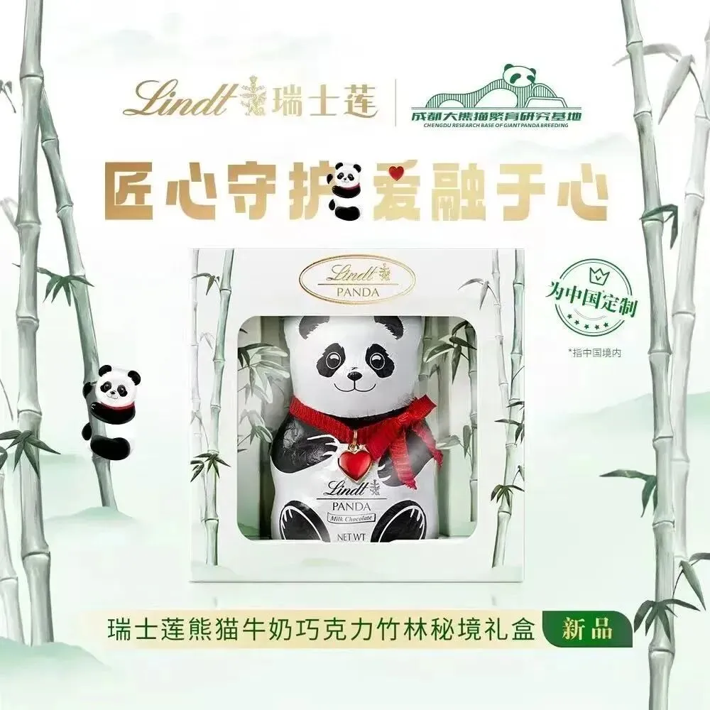 值得一提的是,瑞士莲携手成都大熊猫繁育研究基地,专为中国市场定制的熊猫牛奶巧克力竹林秘境礼盒,以熊猫为核心主题,不仅在包装上采用萌趣可爱的熊猫造型,更融入了竹林景致的设计元素,营造出浓郁的东方美学意境,让人眼前一亮。