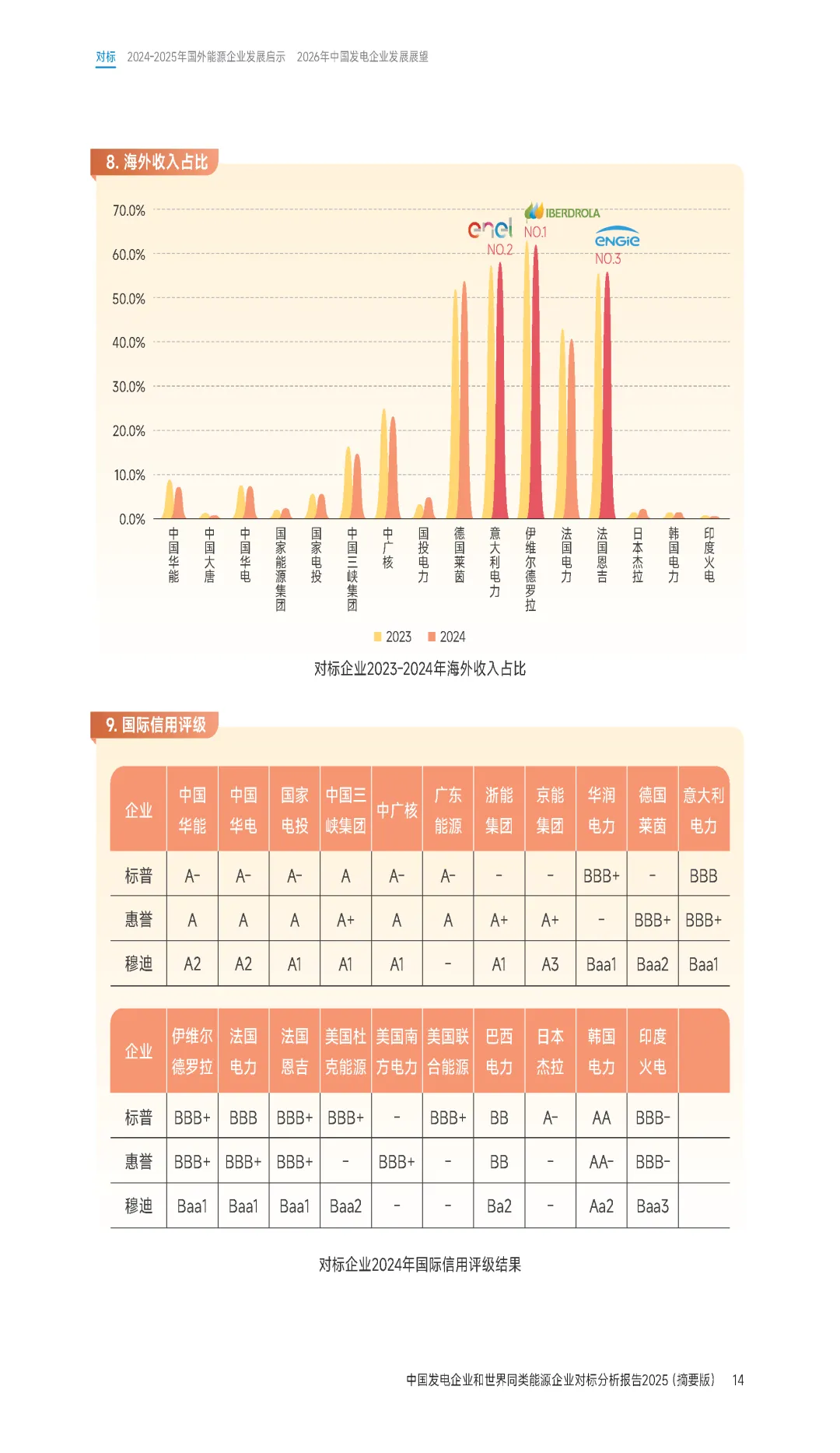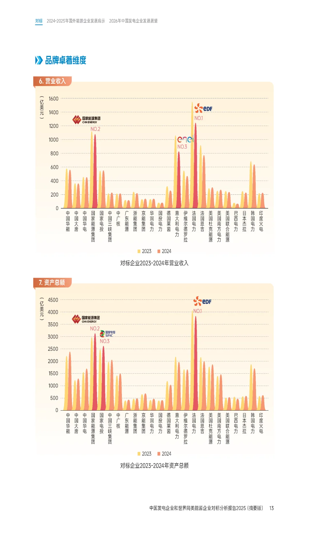 报告第一部分综合对标结果显示,2024年度法国电力、国家能源集团、中国三峡集团、中国华能、意大利电力、国家电投、伊维尔德罗拉、中广核等企业综合对标排名居前八位,处于第一方阵。