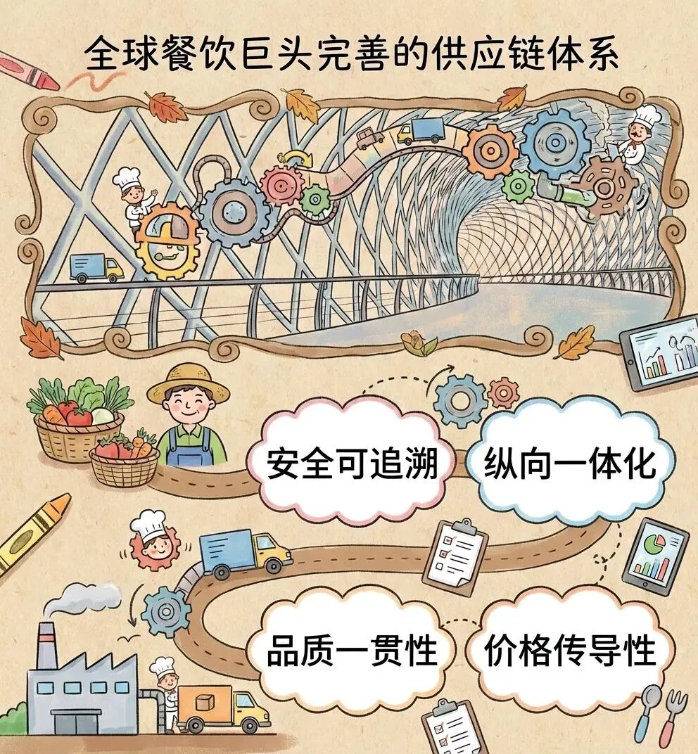 报告还对比了中国餐饮企业与全球知名品牌的差异,并从供应链角度探索了中国餐饮的出海路径,核心聚焦四大维度:安全可追溯、纵向一体化、品质一贯性、价格传导性。