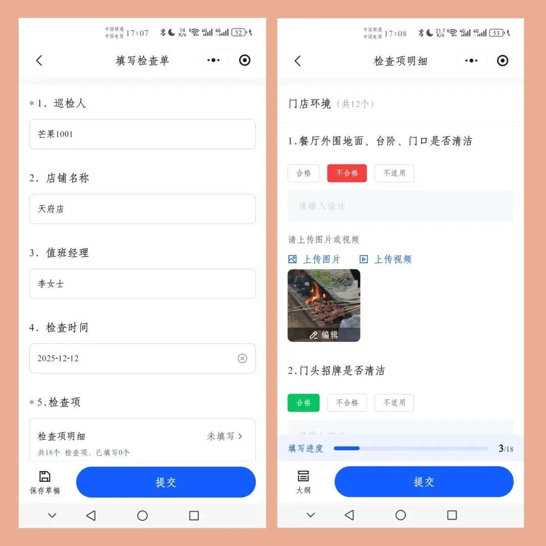 店长或督导巡店时,不再凭感觉,而是对照清单逐项核对。关键项(如冰箱温度、餐具消毒)必须用 “水印拍照” 上传现场照片,确保检查真实可信、过程留痕,实现 “执行 - 追溯” 闭环。