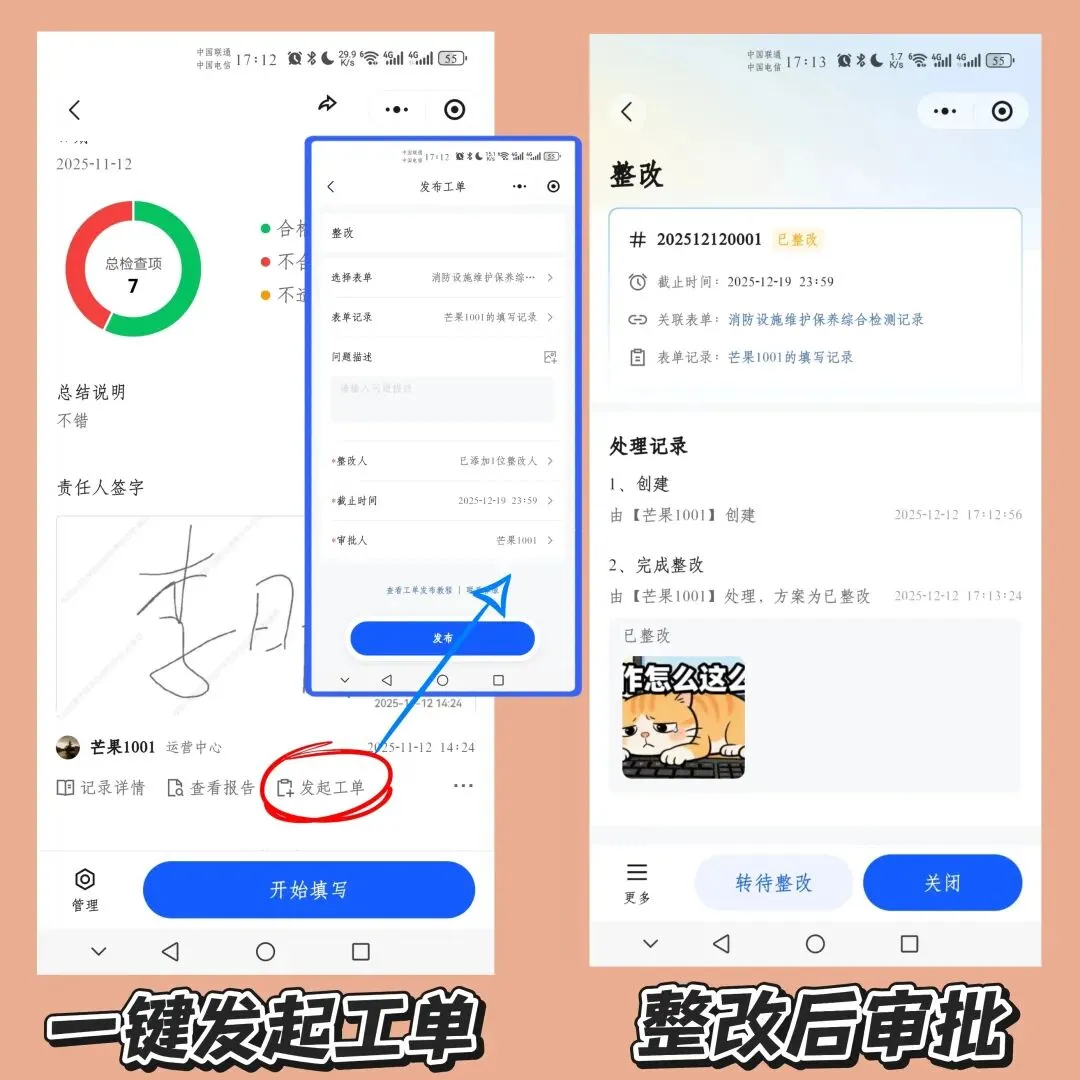 检查中发现的问题,一键生成整改工单,指定责任人、限定解决时间,形成 “发现 - 解决” 高效闭环,确保所有门店品质统一。