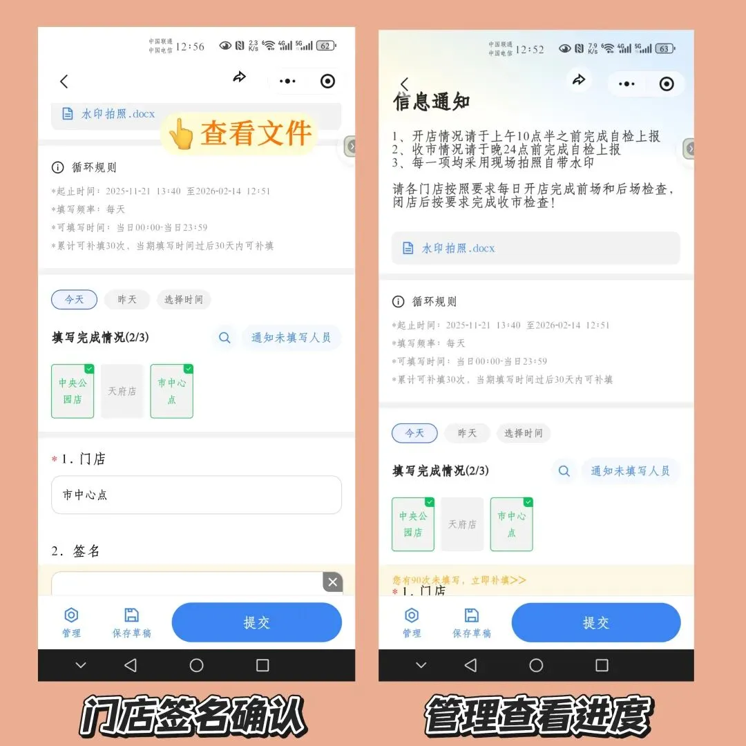 总部要推新促销方案或调整话术时,通过企鲸把通知和培训要点精准推送到每家门店(可附文件、视频说明),确保门店充分理解执行。已确认通知的门店名称自动点亮,管理者实时查看确认状态,保证政策 “无损传达”“强力执行”。