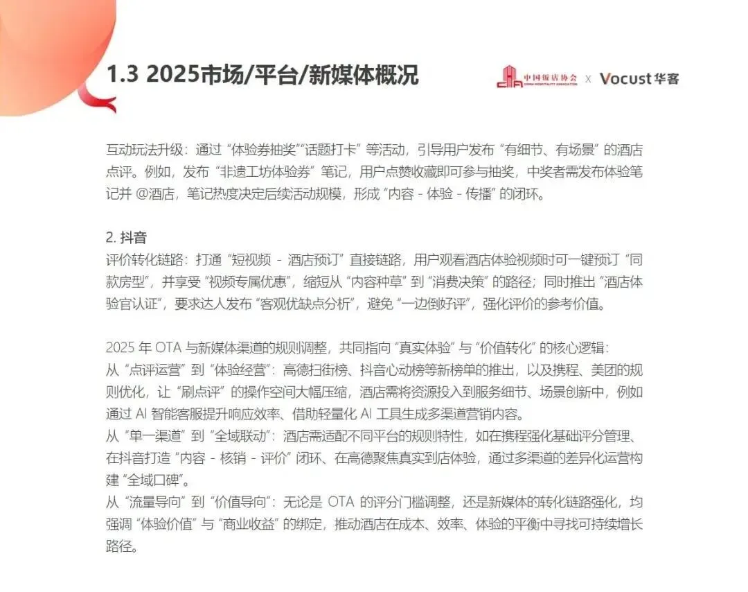 平台规则同步升级:平台纷纷强化真实体验导向。例如,抖音打通短视频—预订链路,要求达人发布包含优缺点的客观测评;高德上线扫街榜,依赖真实到店数据;OTA平台则提高点评分门槛,压缩评论作假空间。酒店必须从点评运营转向体验经营。
