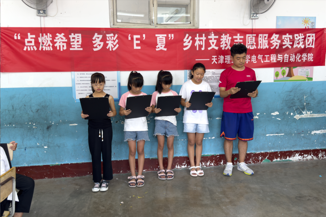 为深入学习宣传贯彻习近平新时代中国特色社会主义思想和党的二十大精神,学习团的十九大精神,贯彻习近平总书记关于青年学生成长成才重要思想,全面贯彻党的教育方针,落实立德树人根本任务,深入推进大中小学思政课一体化建设,引领广大青年学子在追随习近平总书记足迹的生动实践中助力乡村振兴,贡献青春力量。天津理工大学电气工程与自动化学院组建“点燃希望 多彩‘E’夏”乡村支教志愿服务实践团,深入天津市蓟州区乡村开展为期两周的暑期支教活动。