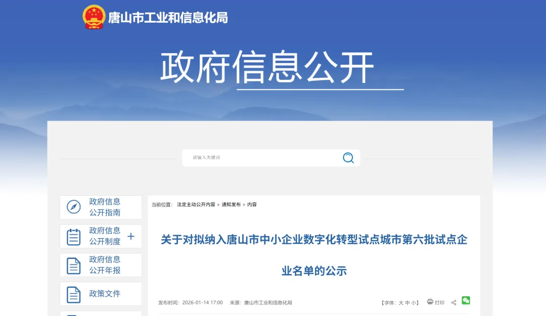 为深入贯彻落实党中央、国务院关于支持中小企业创新发展、加快中小企业数字化转型的系列决策部署,扎实推进我市中小企业数字化转型试点城市工作,按照《唐山市中小企业数字化转型试点城市工作推进方案》(唐政办字〔2025〕1号)、《唐山市工业和信息化局关于征集中小企业数字化转型试点企业(第六批)的通知》要求,我局组织开展了唐山市中小企业数字化转型试点城市试点企业(第六批)征集工作。经企业申报、县区工信主管部门初审、专家审核等程序,确定了拟纳入唐山市中小企业数字化转型试点城市试点企业(第六批)名单(排名不分先后),现将名单予以公示。欢迎社会各界参与监督,如有相关意见及建议请于公示期内以实名及书面形式反馈,并提供必要证明材料。公示期为2026年1月14日-2026年1月21日。
