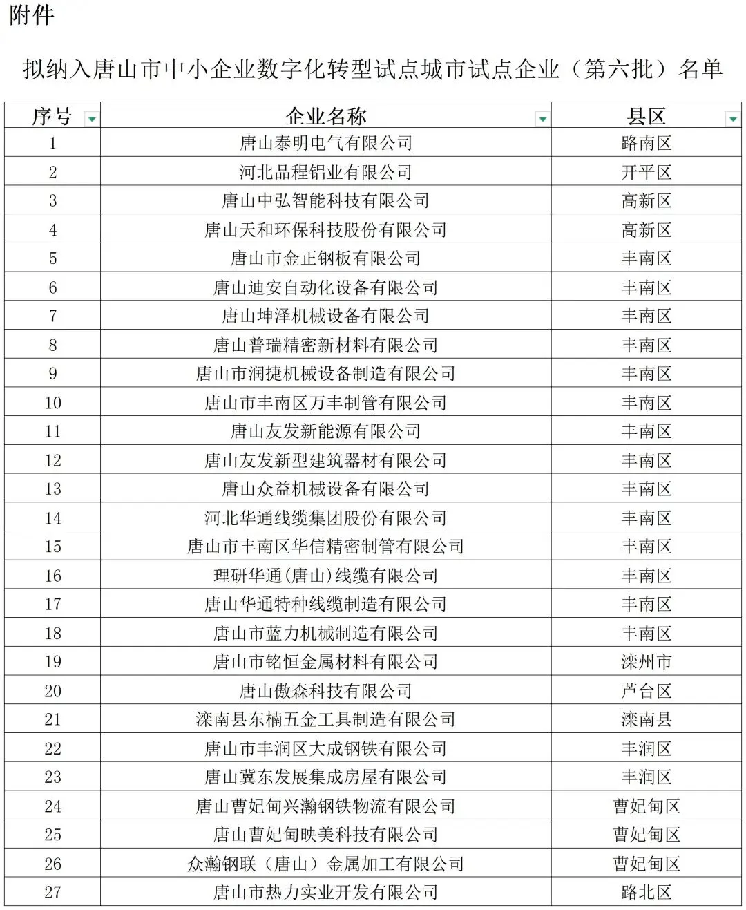 关于对拟纳入唐山市中小企业数字化转型试点城市第六批试点企业名单的公示