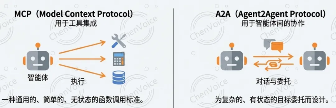 两个互补的协议是关键。它们的核心区别在于:MCP 用于与工具交互(执行简单的、无状态的功能),而 A2A 用于与其他 Agent 协作(达成复杂的、有状态的目标)。