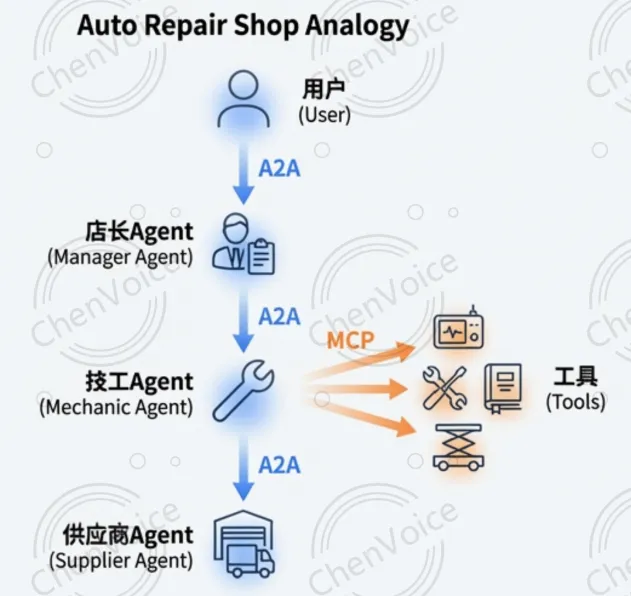 Agent-to-Agent (A2A):“店长”Agent 将任务委托给专业的“机械师”Agent。