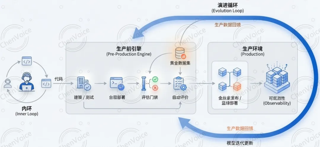 “演进”是将生产洞察转化为长期改进的过程。它利用生产数据,主动让 Agent 变得更智能、更高效。而驱动这一过程的引擎,正是投产前建立的自动化 CI/CD 流水线。预生产阶段建立的质量门禁和安全发布策略,是让这种快速演进成为可能且安全的前提——它们是同一枚硬币的两面,共同将风险转化为速度。