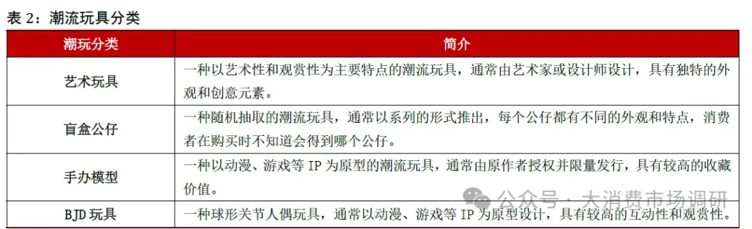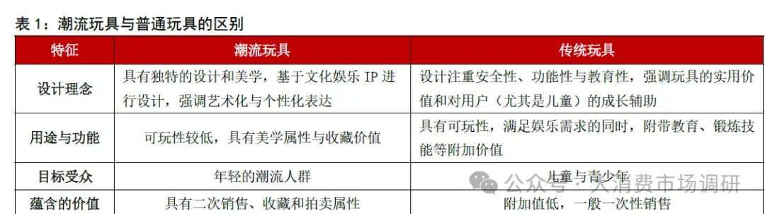 潮流玩具区别于传统玩具,更强调艺术与个性化表达。潮流玩具是将潮流文化与相关内容巧妙融合的一类玩具。它与传统玩具不同,潮流玩具大多凭借独特的设计和出众的美感来吸引消费者,并且多数是基于授权的潮流内容创作而成,强调美学属性和收藏价值,具有二次销售、收藏和拍卖等属性。