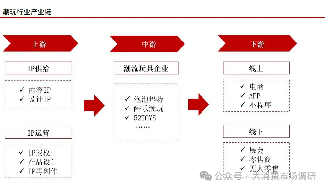 潮玩行业产业链。从潮玩产业链来看,潮玩产业链上游主要系IP 供给和运营,负责IP的设计、授权、再创作等;产业链中游以泡泡玛特、52TOYS 等潮玩企业为典型代表;产业链下游主要为销售渠道,消费者可以通过电商等线上平台与零售商等线下渠道购买产品。