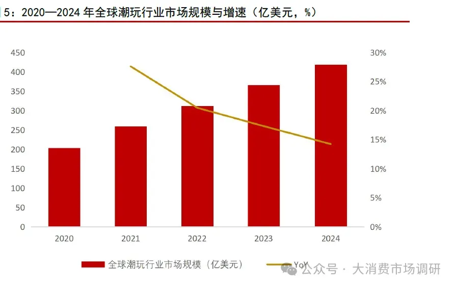 全球潮玩市场规模近几年呈增长态势。潮玩文化凭借其独特的IP 魅力、个性化表达以及收藏属性,打破了地域与年龄的界限,近几年全球潮玩市场规模增速均维持双位数增长。根据中商产业研究院数据,2020—2024 年全球潮玩行业市场规模从203 亿美元增加至418 亿美元,年均复合增速将近20%。