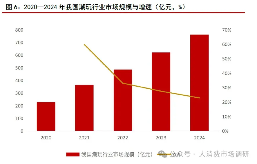 我国潮玩市场蓬勃发展。随着潮玩在全世界兴起,盲盒、手办等核心品类逐步走进大众视野并被消费者认可和接受,目前已成为年轻人表达自我、社交互动的新载体,我国潮玩市场近几年蓬勃发展。根据中商产业研究院数据,我国潮玩市场规模从2020 年的229亿元增加至2024 年的763 亿元,年均复合增速为35.11%。
