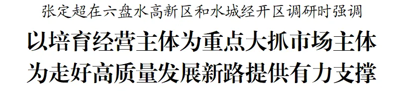 1月13日,市委书记张定超到六盘水高新区和水城经开区调研市场主体培育扶持工作。他强调,要深入学习贯彻党的二十届四中全会精神,进一步贯彻落实习近平总书记在贵州考察时的重要讲话精神,按照省委经济工作会议和“新年第一会”部署,以培育经营主体为重点大抓市场主体,全力做好培育扶持和纾困解难工作,为走好六盘水高质量发展新路提供有力支撑。