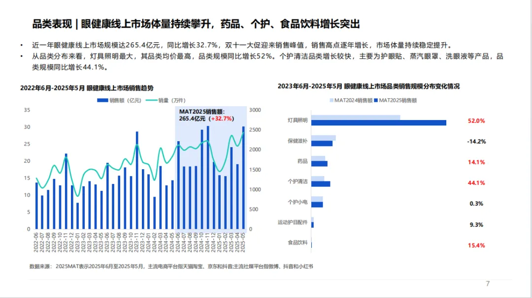 行业需求增长动力强劲。政策层面,国家连续出台多项近视防治与眼健康规划政策,规范防控诊疗流程;人群层面,20 岁以下近视患者预计 2025 年达 1.9 亿人,全年龄段眼部疾病高发且不可逆,催生旺盛预防护理需求。社媒端,眼健康话题近一年声量达 1956.5 万条,小红书平台热度逆势增长,医学科普、近视防控等内容受关注。市场规模方面,线上市场规模达 265.4 亿元,同比增长 32.7%,灯具照明、个护清洁品类增速突出。