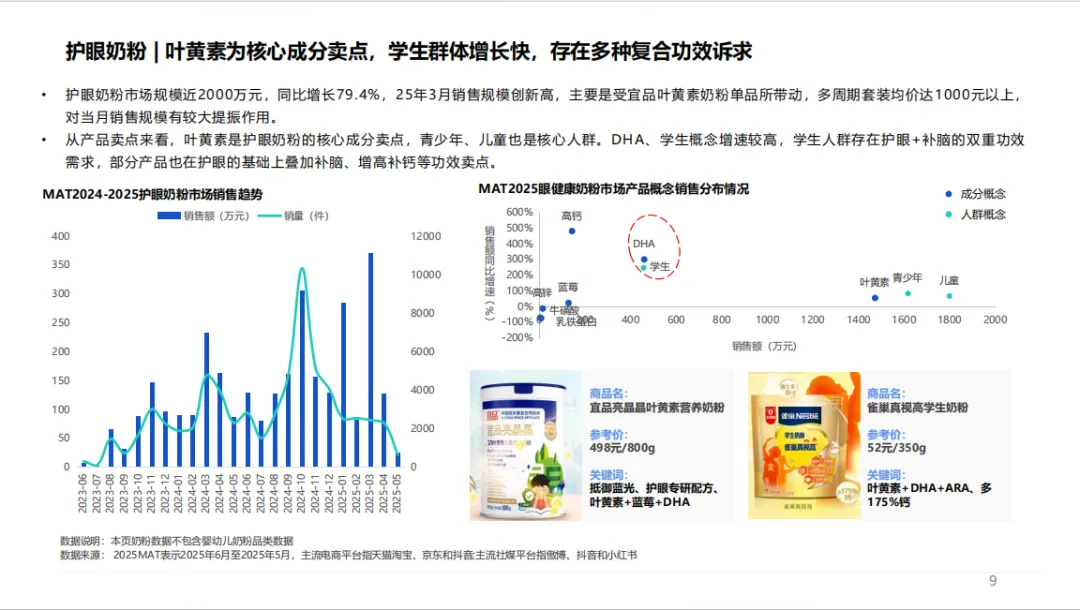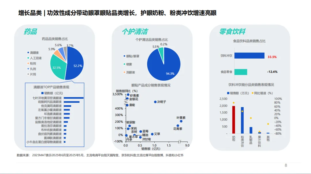 成分与品类趋势分化显著。专业护眼成分中,叶黄素、蓝莓认知度领先,但越橘、藏红花素等高端成分爆发式增长,越橘产品销售额同比增 19.6%,进口品牌垄断高端市场。泛护眼成分呈现两极分化,维生素 B 族增长 292.7%,而传统基础营养成分需求萎缩。药品市场中,OTC 药品稳健增长,处方药增速达 36.8%,硫酸阿托品滴眼液、七叶洋地黄双苷滴眼液等成为增长引擎,价格端呈现中高端化趋势。功能性食品表现亮眼,护眼奶粉同比增长 79.4%,叶黄素 + DHA 复合配方受青睐。