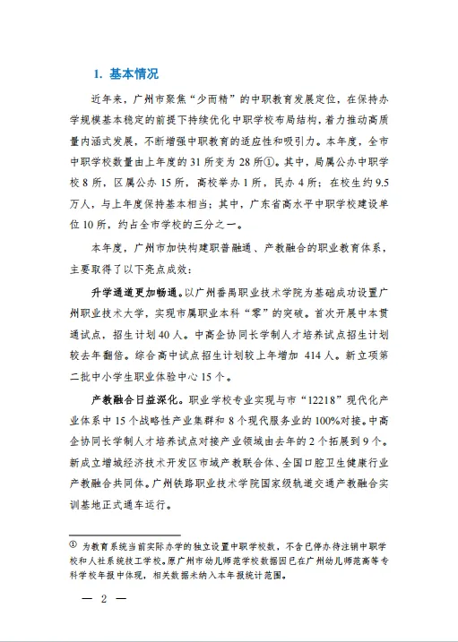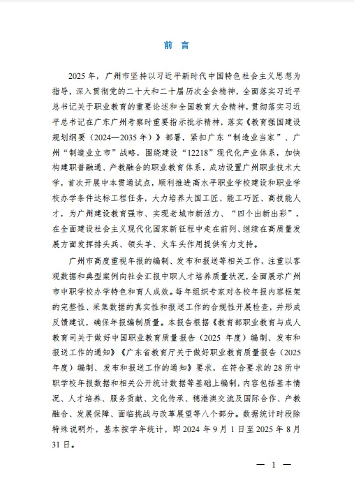 2025 年,广州市以习近平新时代中国特色社会主义思想为指导,紧扣 “制造业立市” 战略,围绕 “12218” 现代化产业体系,加快构建职普融通、产教融合的职业教育体系,取得显著成效。本报告基于 28 所中职学校数据编制,全面呈现了广州中职教育的发展全貌。