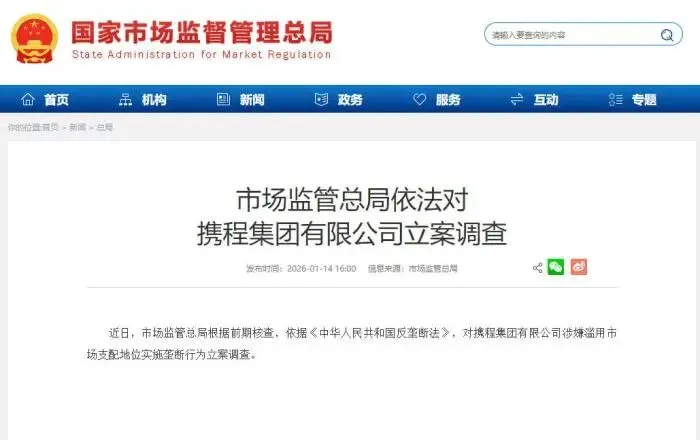 2026年1月14日下午4点,国家市场监督管理总局的一则简短通报,在旅游行业掀起轩然大波:依据《反垄断法》,对携程集团有限公司涉嫌滥用市场支配地位实施垄断行为立案调查 。