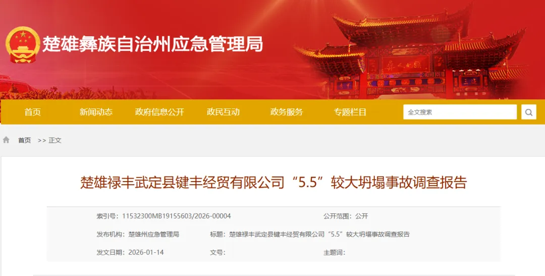 日前,云南楚雄州应急管理局公布《楚雄禄丰武定县键丰经贸有限公司“5·5”较大坍塌事故调查报告》。