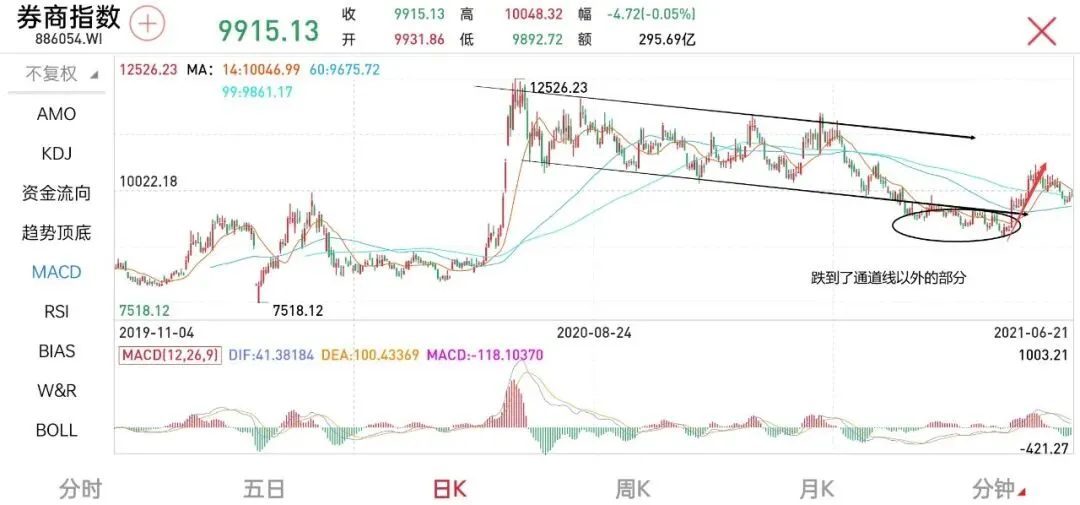 券商指数从去年7月份创下阶段性高点之后,也一度处于典型的下行通道当中,