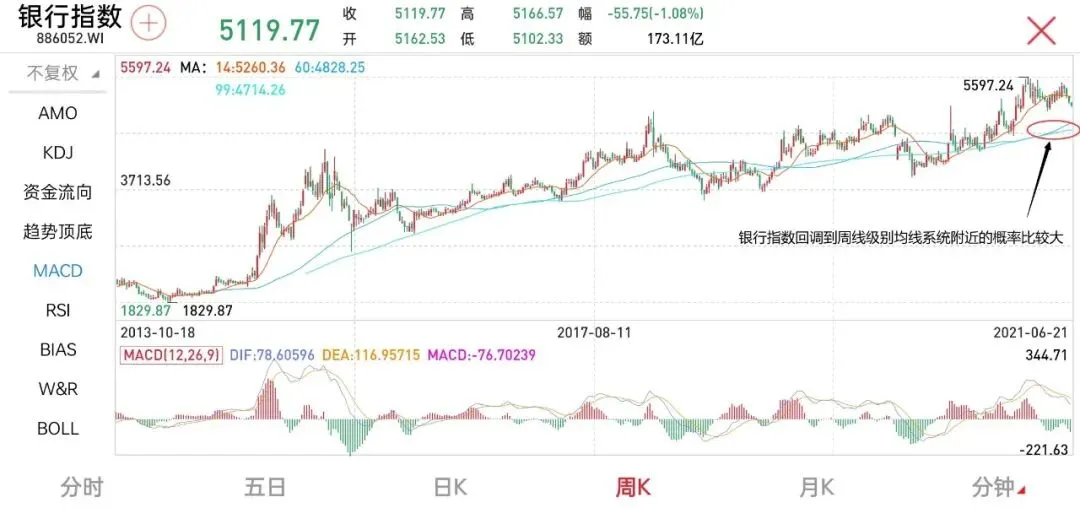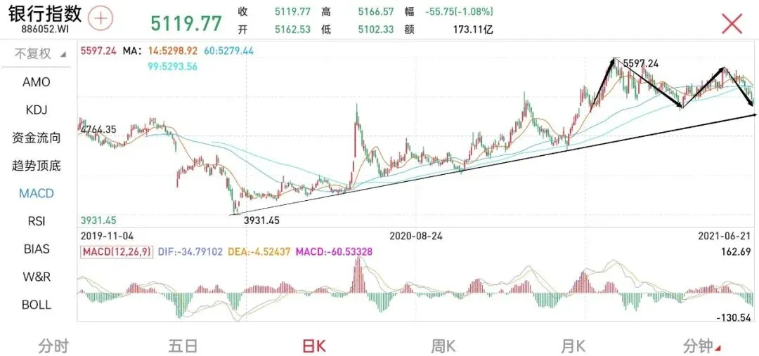 银行指数近期的走势不是很好,即使不加技术分析的辅助线我们也能明显的看到银行指数的短期疲弱状态,
